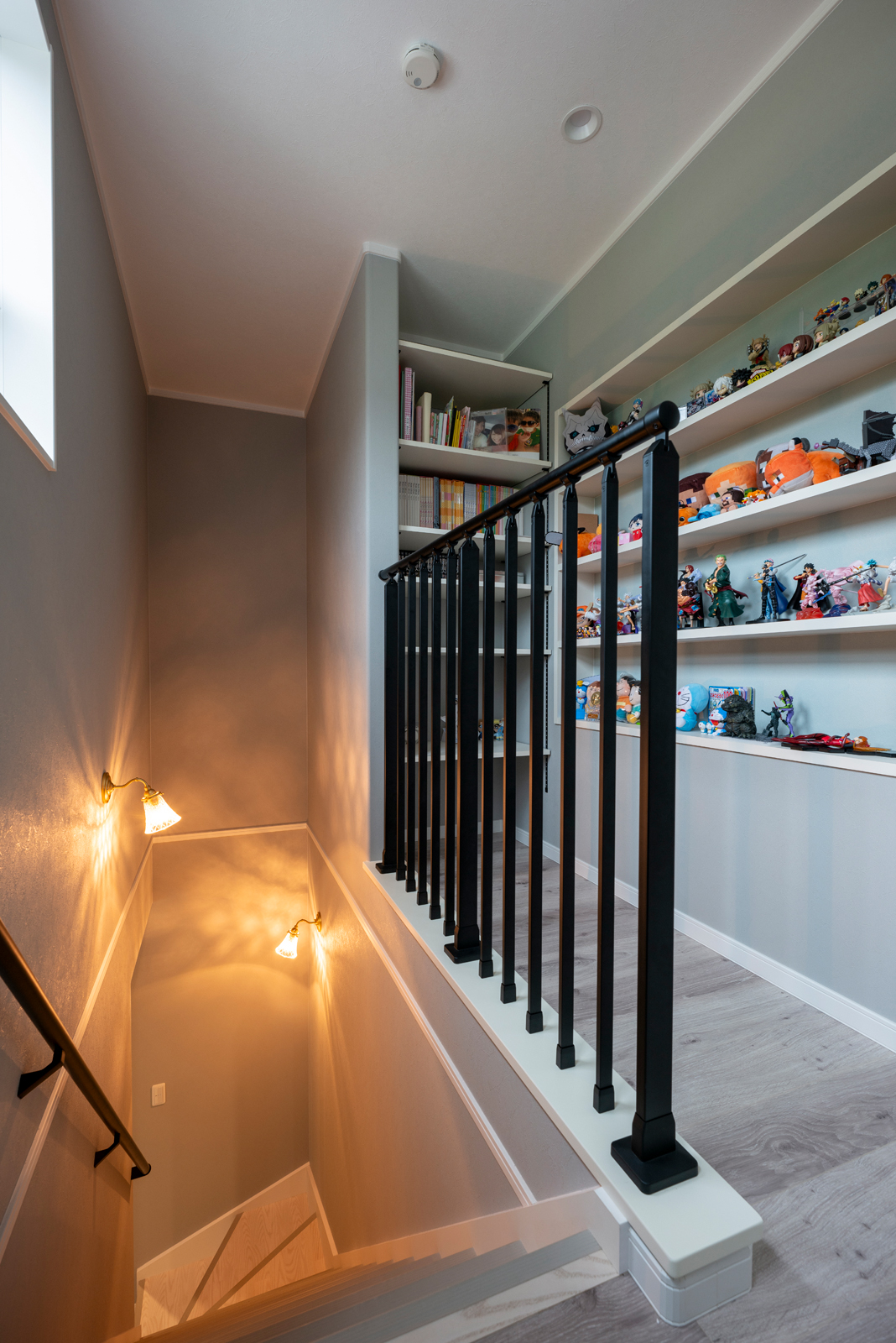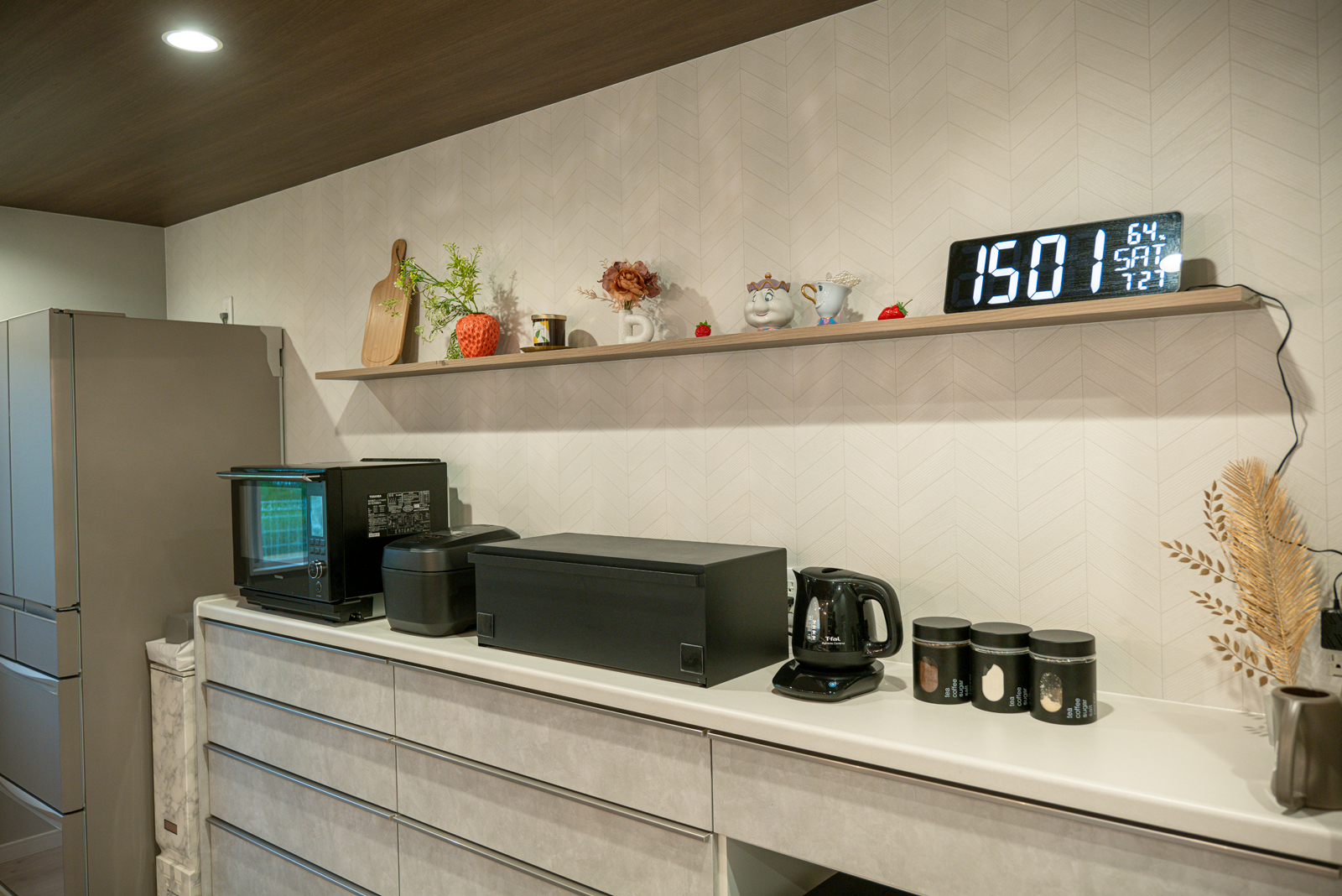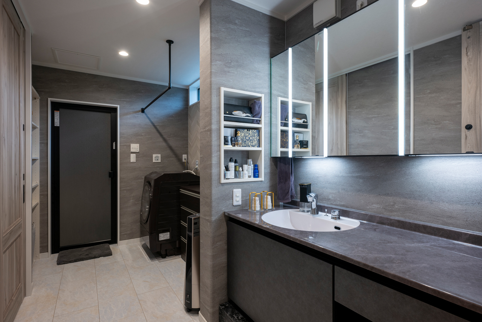 帰宅するたびに「建ててよかったと感じる」デザインは奥さまのセンスが光ります。照明は部屋ごとに選び、飾り棚やニッチを各所に配置。洗面台は人工大理石の天板や大きな鏡、間接照明でホテルライクに仕上げました。家族共用のカウンターも収納やコンセントは掘り込みにしてすっきりとした印象。壁紙も丁寧に選び、細かく切り替えました。