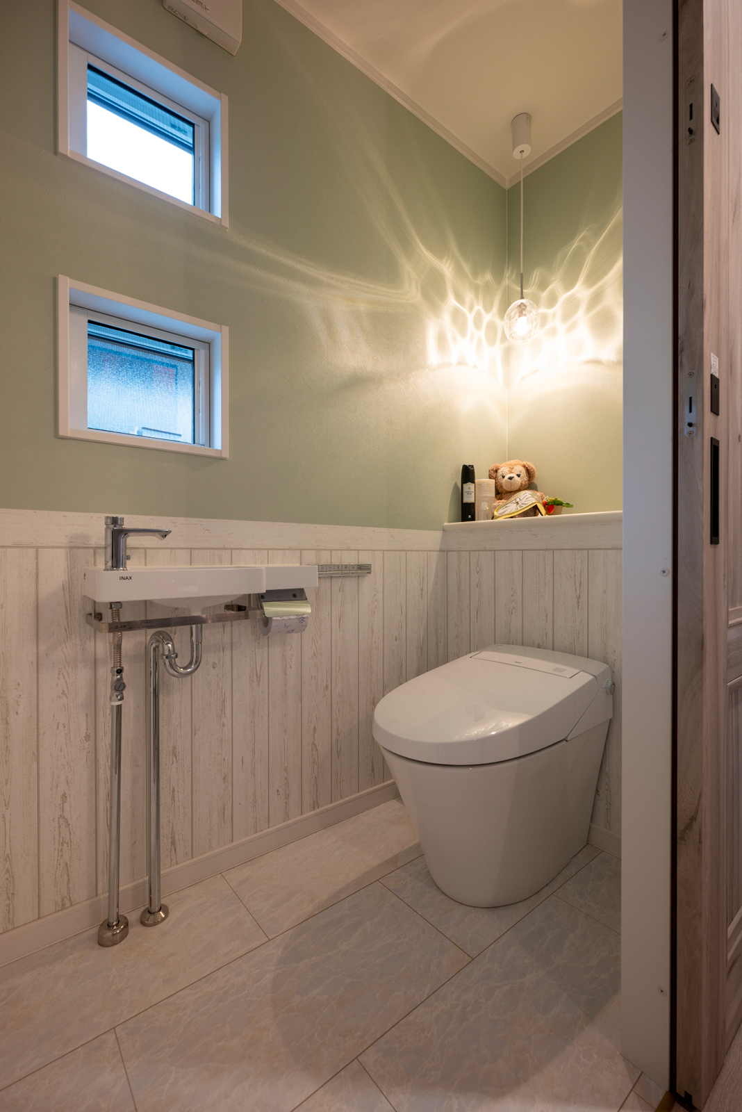 水面のような光が壁に投映されるペンダントライトも照明の配置も奥さまのこだわり。トイレは1カ所だけなので、2階からも入りやすいよう階段の向かいに配置