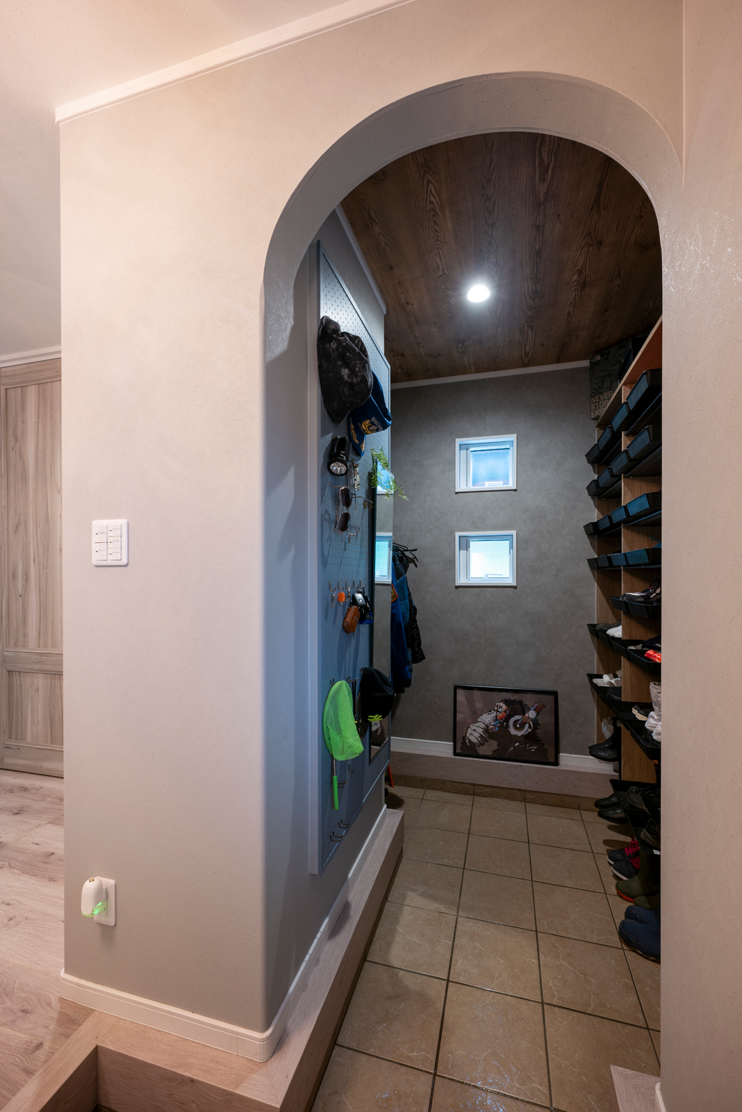 大収納のシューズクローゼット。玄関まで暖かいので、雪や雨で濡れた靴やコートを置いておくだけで乾く
