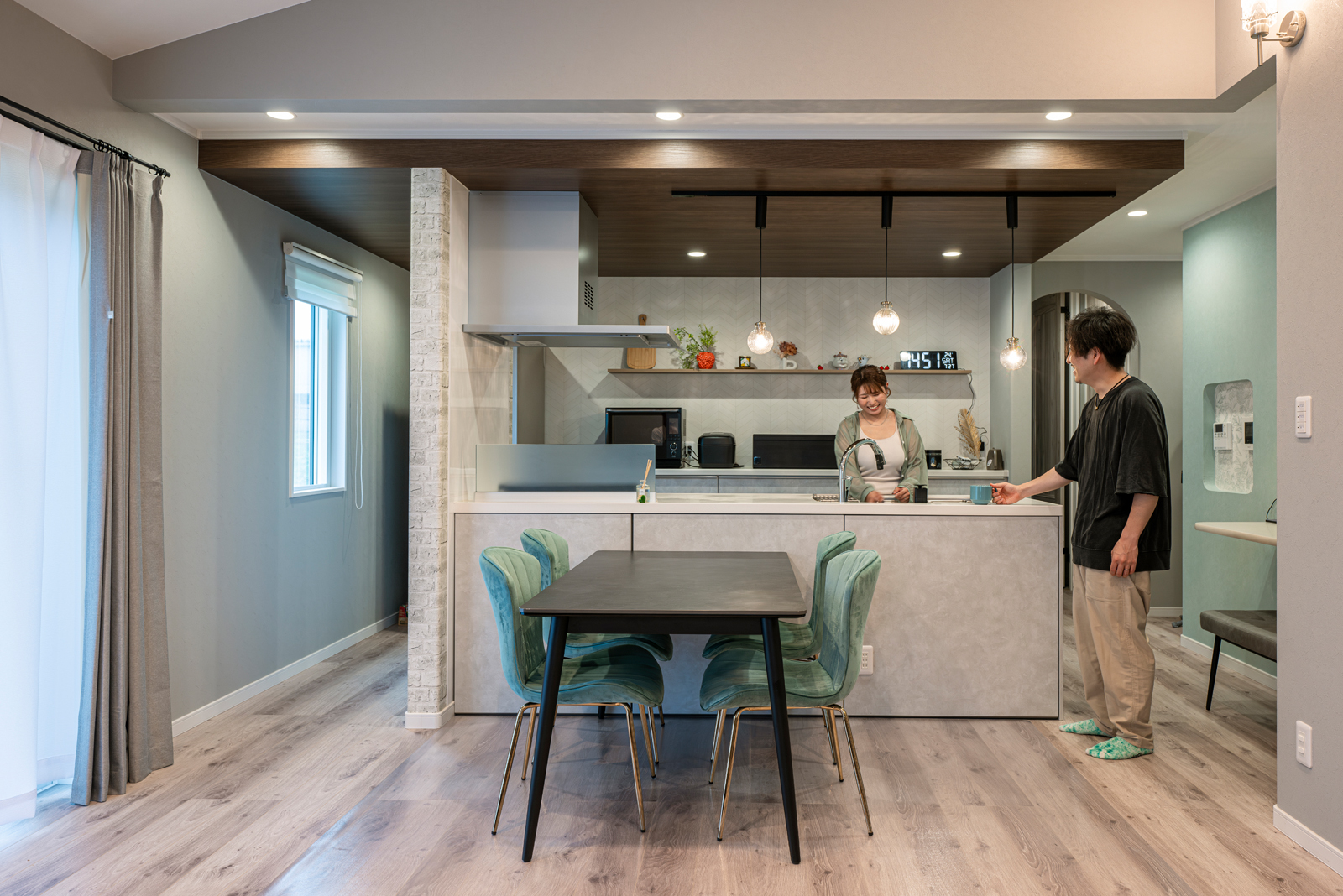 周りを自由に歩けて、ダイニングからも手伝えるアイランドキッチンは、家族との会話を楽しみながら家事ができる。ダークブラウンの木目調にした下がり天井は奥さまの要望