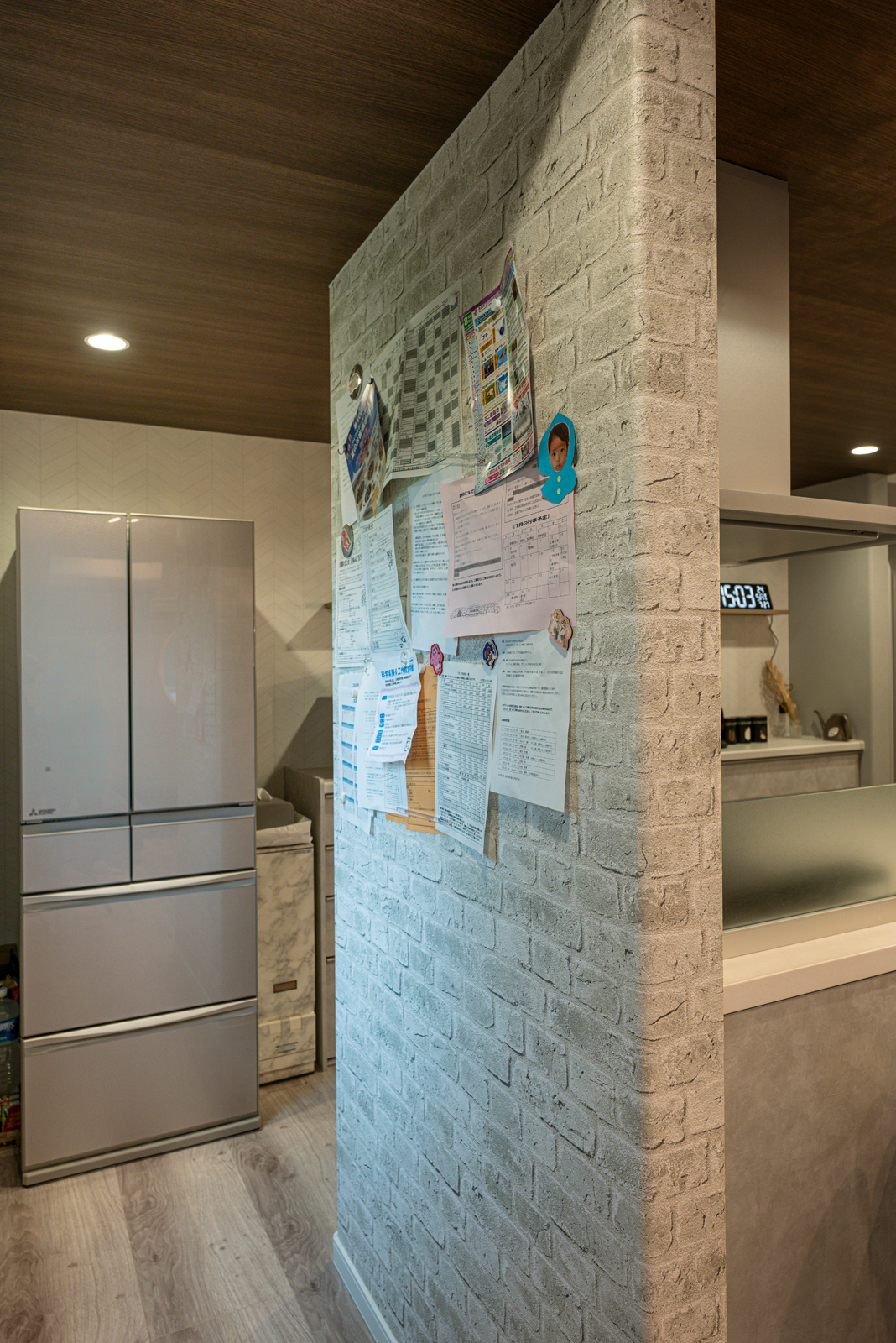 マグネットが付く壁にして学校からのプリントや生活に必要なお知らせを掲示。出入り口から直接目に入らない場所にして、部屋の雰囲気を壊さないように配慮した