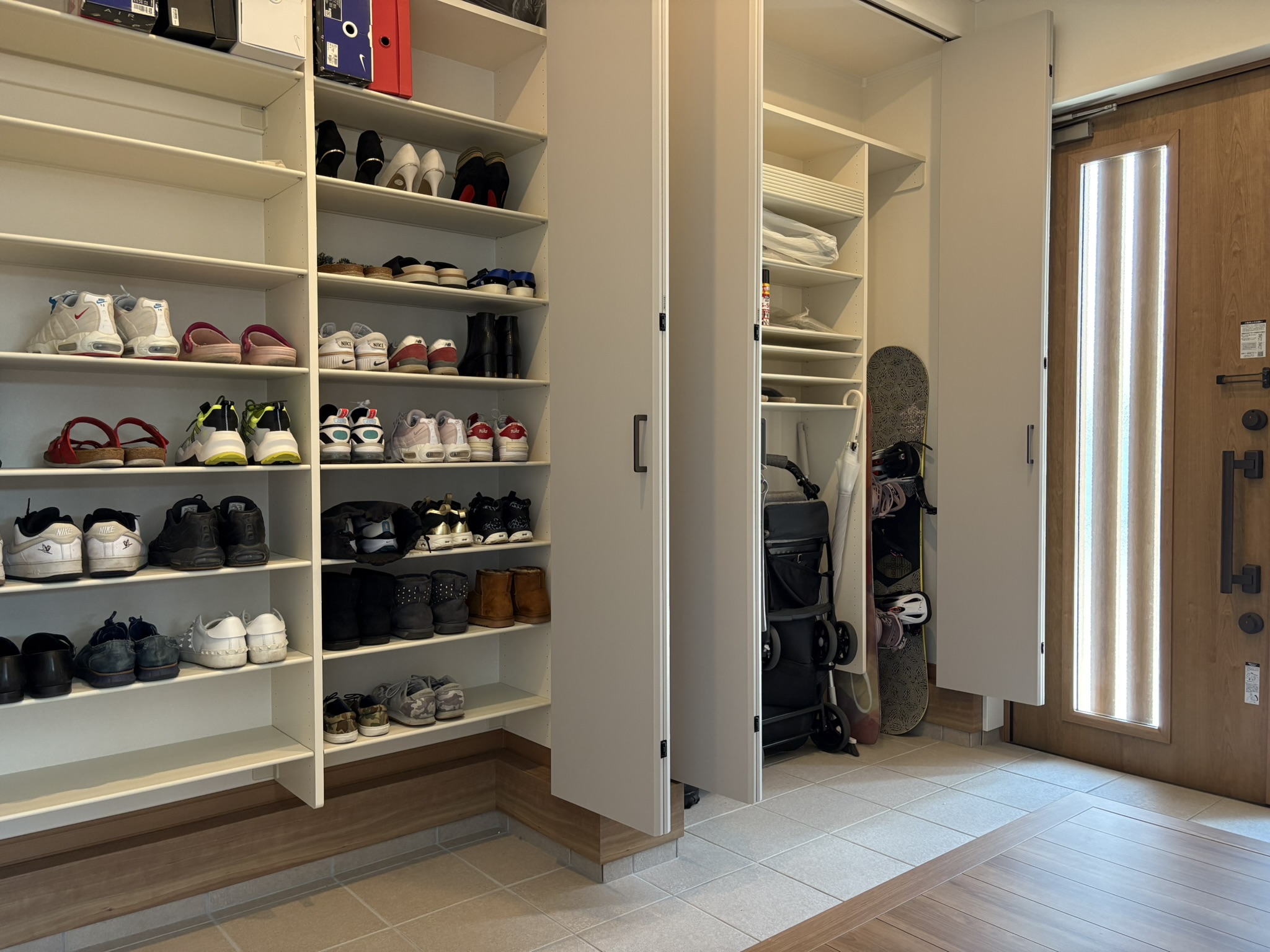広く設けた玄関には大容量のシューズクローゼットを設置。ベビーカーから趣味のスノーボードまで収納することができる。