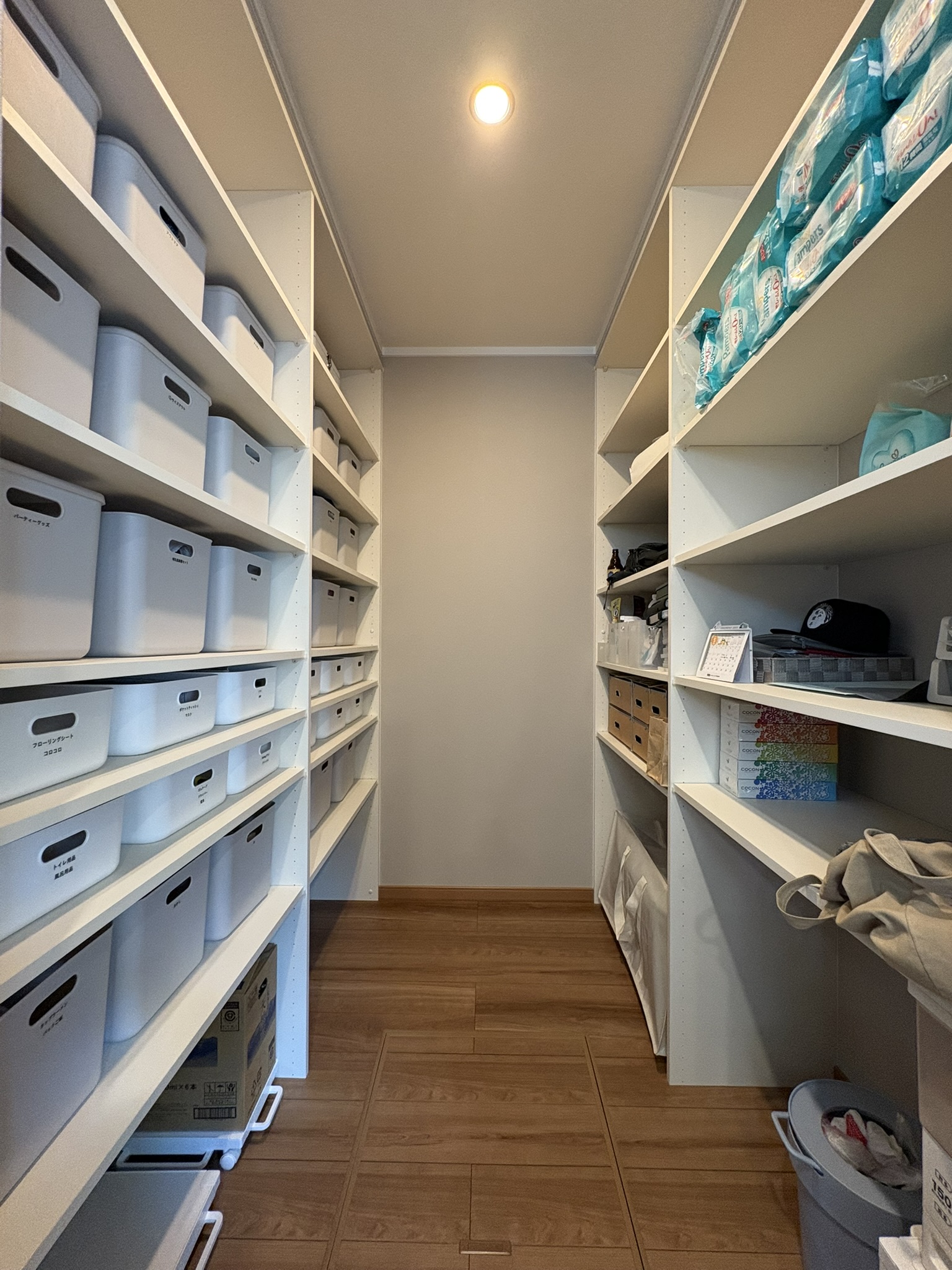 奥さま希望のパントリー。可動棚で好きなようにスペースを作ることができる。通路幅も1m弱あるため、作業もラクラクできる。