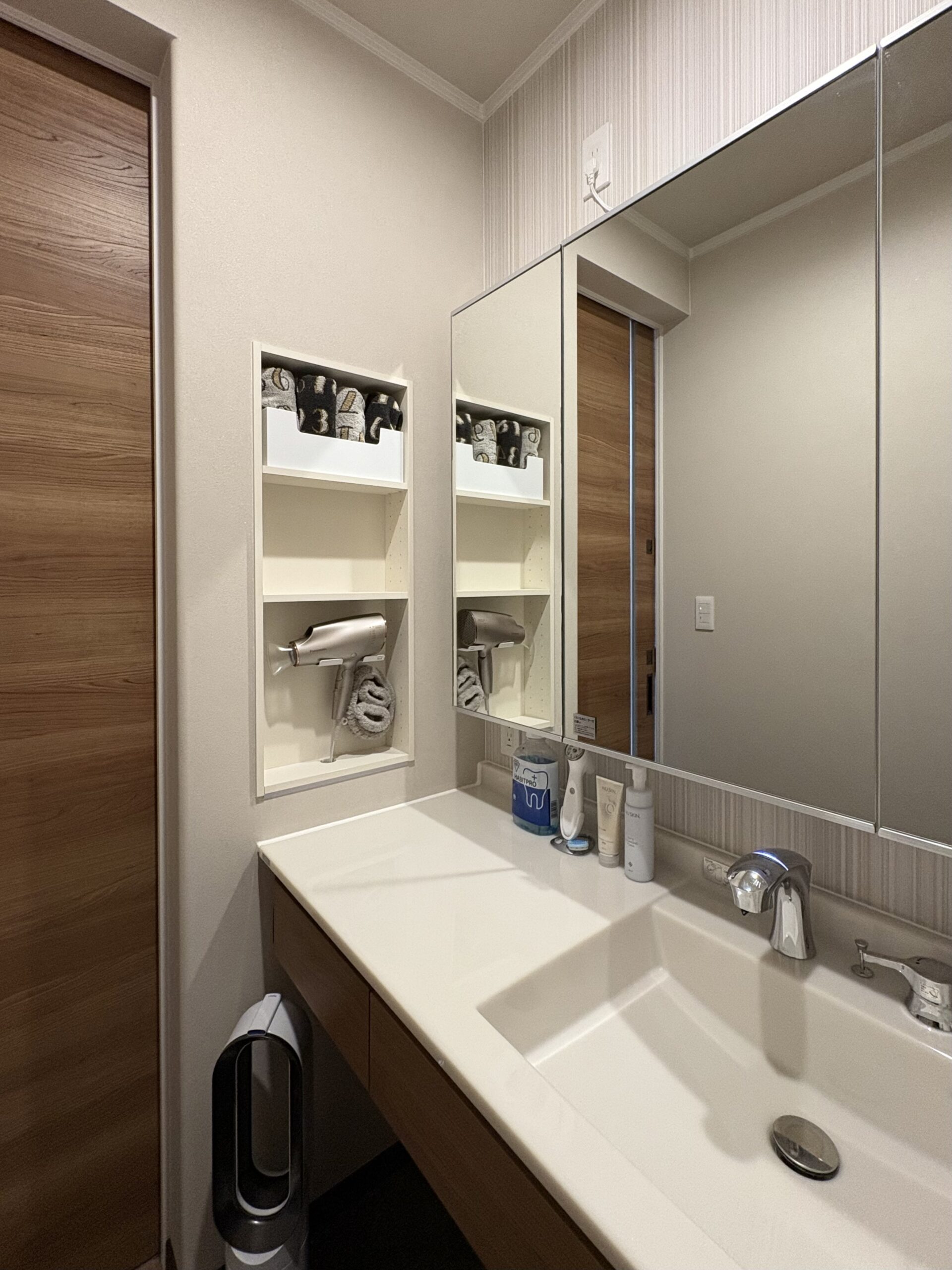 洗面台の横にはニッチを。ドライヤーの定位置を作ったことで使いやすい仕様に。