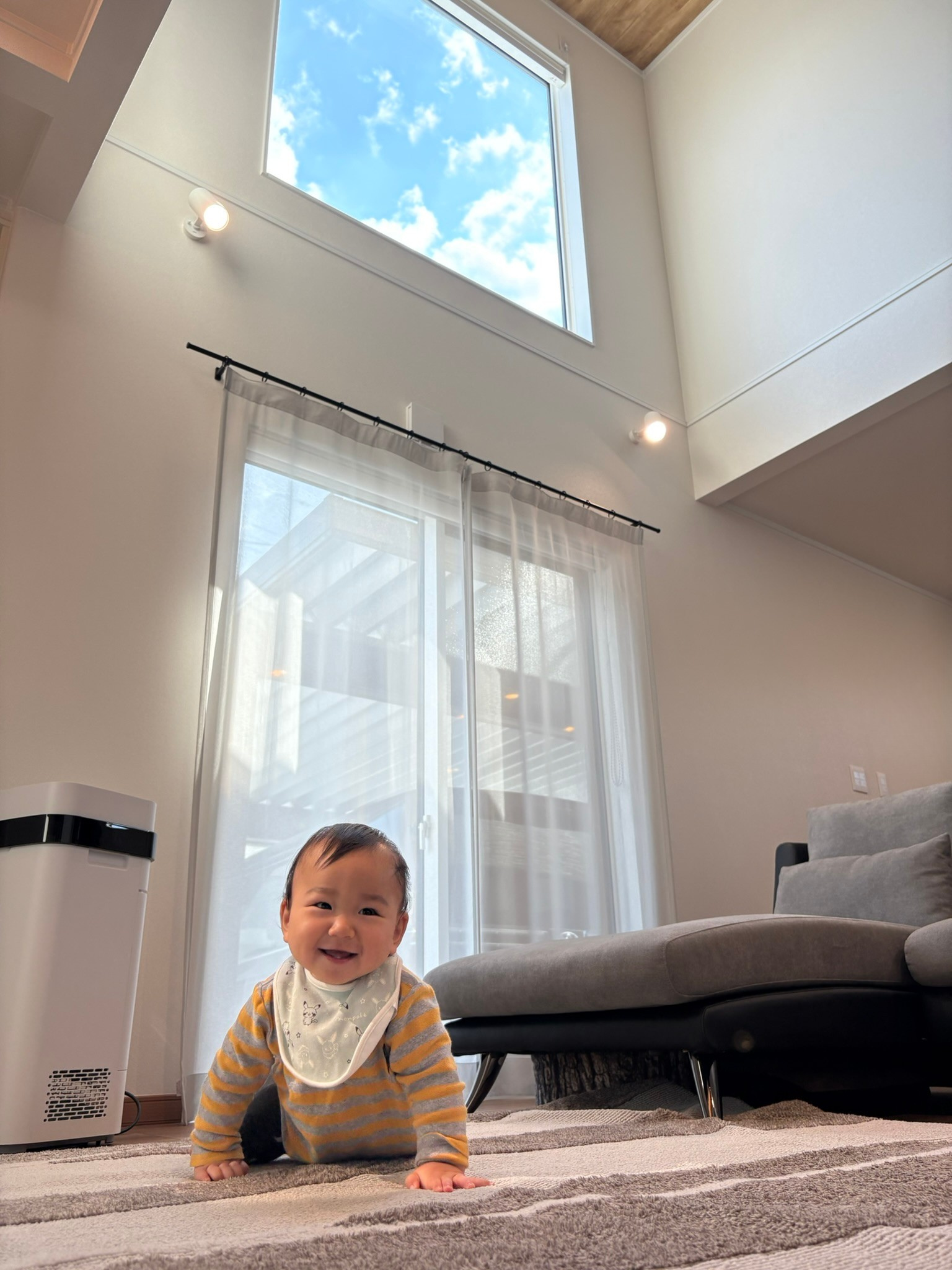 希望の間取りは最初からある程度決まってたそうですが、「玄関は広く、天井は高く、ランドリースペースとパントリーは欲しかった」とご夫婦。その希望通り、ベビーカーを置いても全く窮屈さを感じさせない広々とした玄関をはじめ、リビングは大きな窓と吹き抜けが印象的で開放感を与えてくれます。大きな窓から陽が差し込むため、「カーポートを置いても陽が入るし、夕方まで明るいので電気を全然つけなくていい」とHさん。吹き抜け部分も透明パネルをつけたことにより、全体に明るい光が入る家が完成しました。