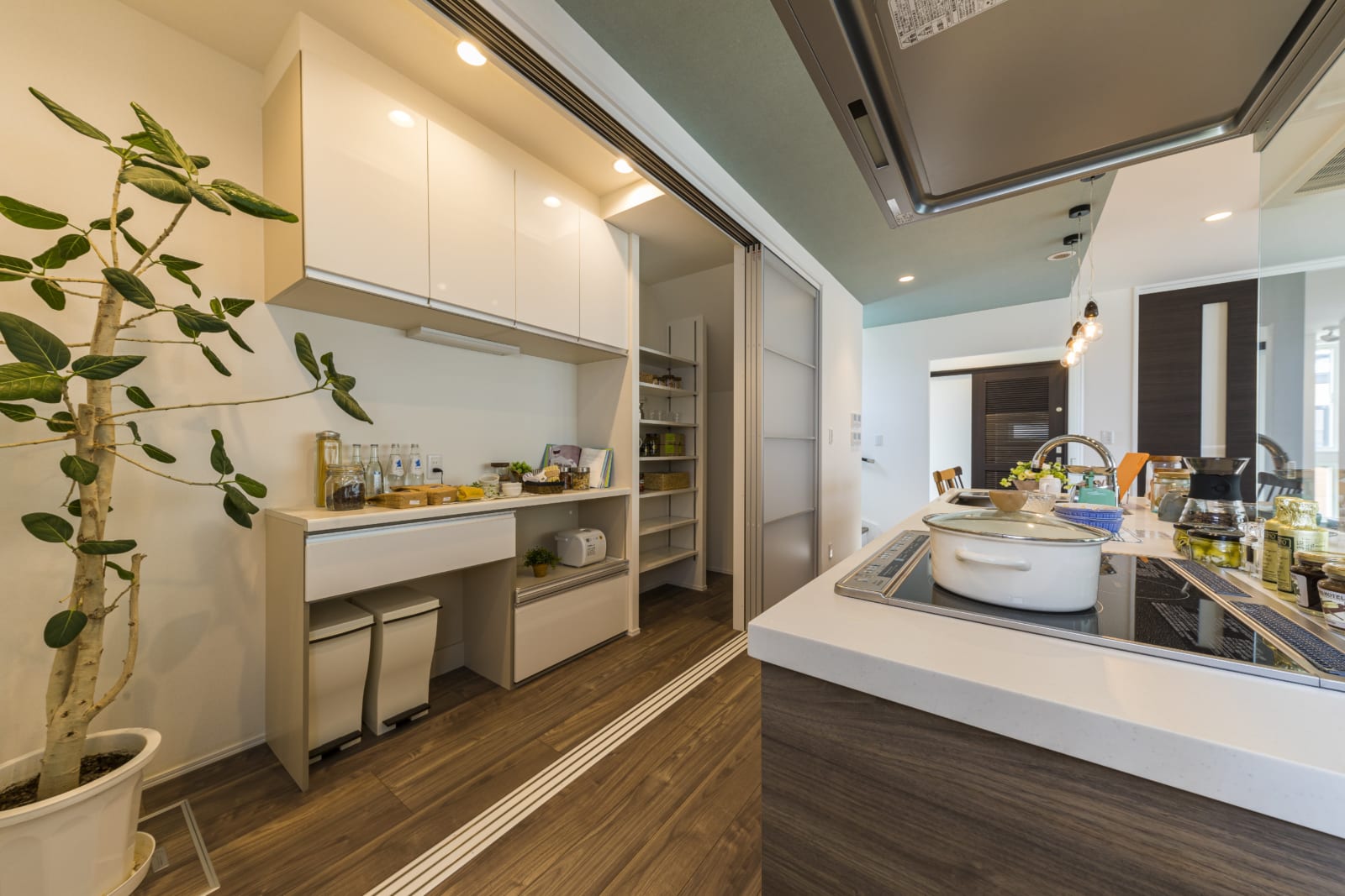 キッチンの後ろにあるパントリーは冷蔵庫もファニチャーも全部隠せるので、急なお客様でも安心です。