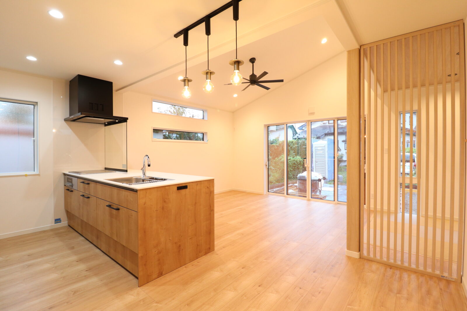 勾配天井やリビングに採用した大きな窓がより空間を広く感じさせてくれます。